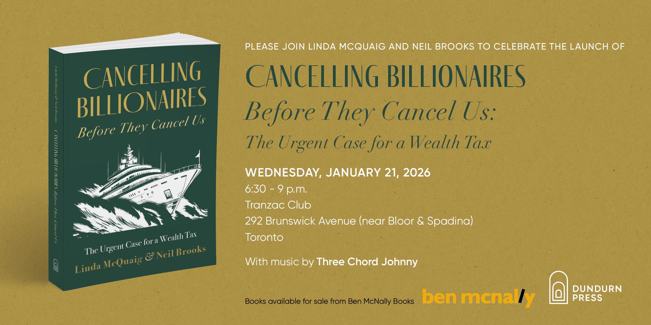 Cancelling Billionaires Before They Cancel Us: The Urgent Case for a Wealth Tax at Toronto's Tranzac Club, 292 Brunswick Avenue (near Bloor & Spadina). With music by Three Chord Johnny. Books will be available for sale from Ben McNally Books.